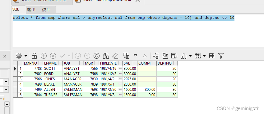 select * from emp where sal > any(select sal from emp where deptno = 10) and deptno <> 10