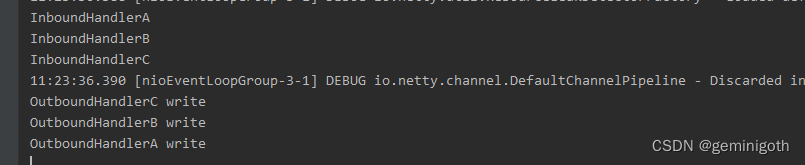 从运行结果上看,Handler的传播顺序:从Inbound开始顺序执行,然后从Outbound逆序执行。
