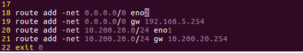 route add -net 10.200.20.0/24 gw 10.200.20.254 为eno1设置网关