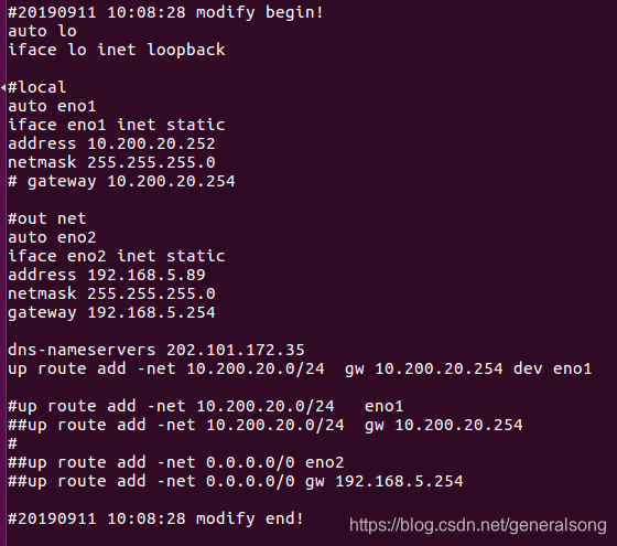 1.修改 /etc/network/interfaces文件,只能设置一个系统默认的网关.本人将eno2外网的网关设为默认网关,