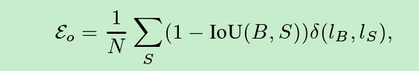 s表示所有的候选区域集合,B表目标边框真值,IOU(B,S)在[0,1]之间,表示真实目标边框和候选区域组成区域的交并比,δ表示一个函数,如果给某个候选区域的娥标签和真实标签一直,其值为1,否则为0。N为候选区域的数量。当Iou大并且标签预测准确时,上式取最小值。对于一个真实的目标框,我们只允许存在一个非背景候选区域。在收敛的情况下,多个目标框重叠的区域被分配给最小的候选区域。