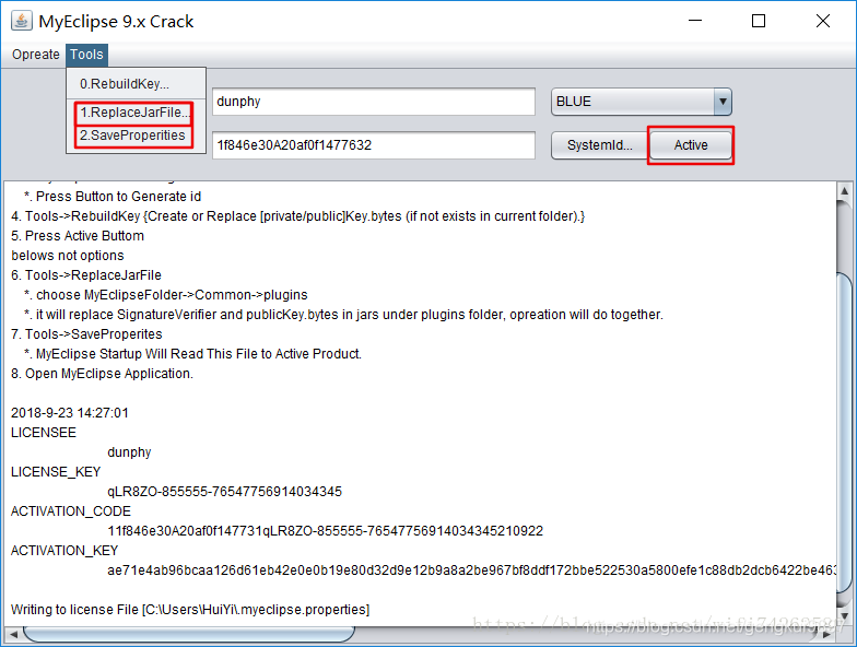在点击Active按钮之后,打开Tools菜单,先执行编号2:SaveProperties 然后再执行ReplaceJarFile,这时会打开一个选择文件对话框,选择安装目录下的plugins就行了(刚刚替换jar包的目录),然后点击打开按钮就行了。