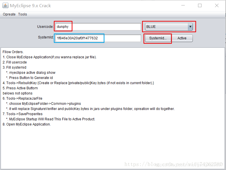 破解的过程就过了一半了(此时开始需要用到java环境),然后执行MyEclipse Cracker 文件夹下的crack.bat(双击),Usercode随便输入,右边的下拉选择按钮,记得选择BLUE,然后点击SystemId...,就会在这个蓝色的框里面生成SystemId