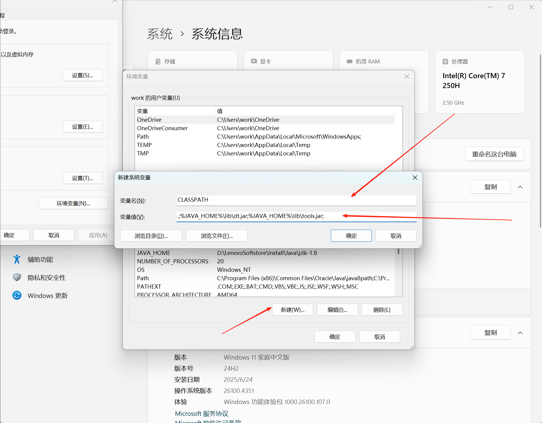 - 如果你版本比较低或是学习需要配置CLASSPATH,依然是在下面系统变量新建环境变量