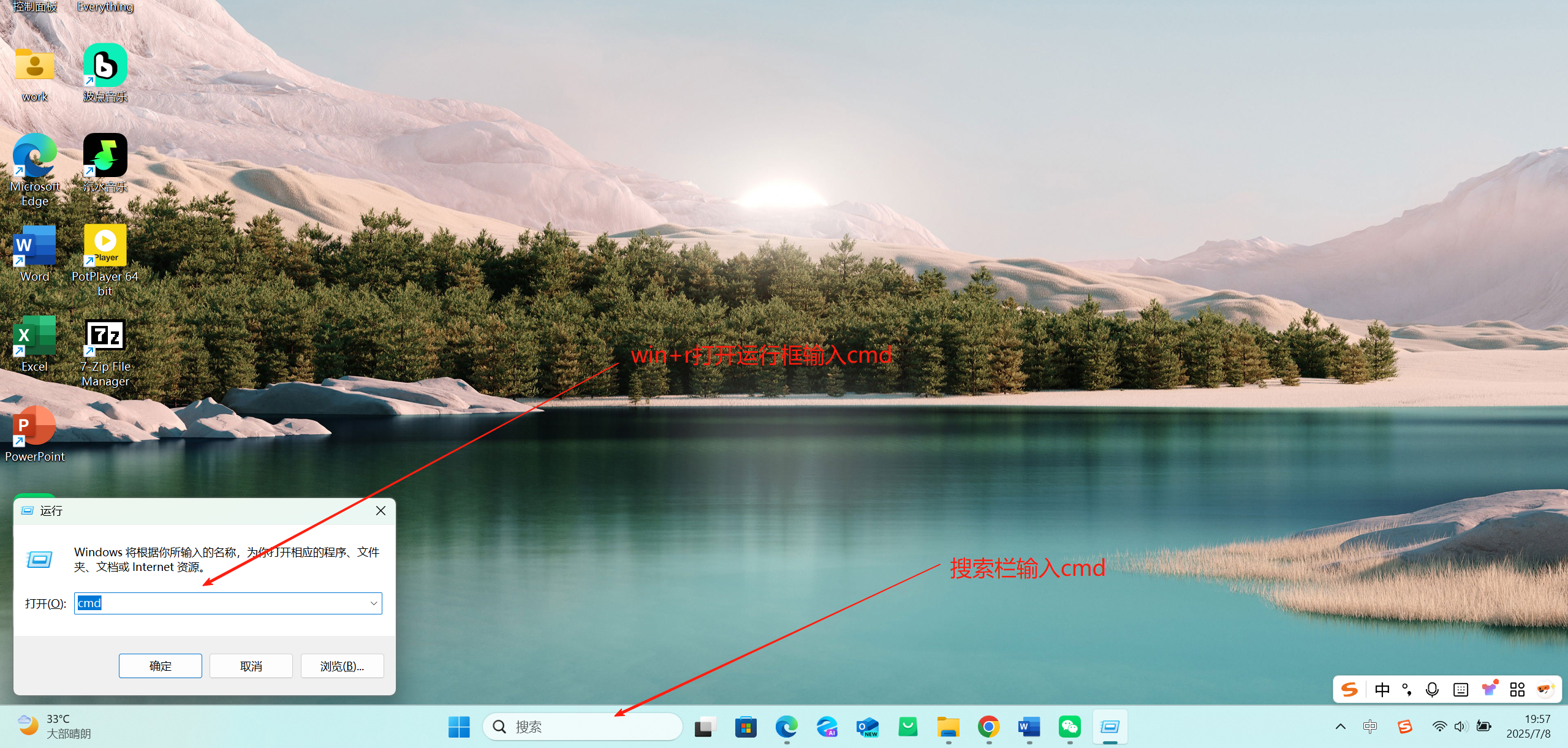 - 搜索栏输入cmd(或者win+r键打开运行框输入cmd)