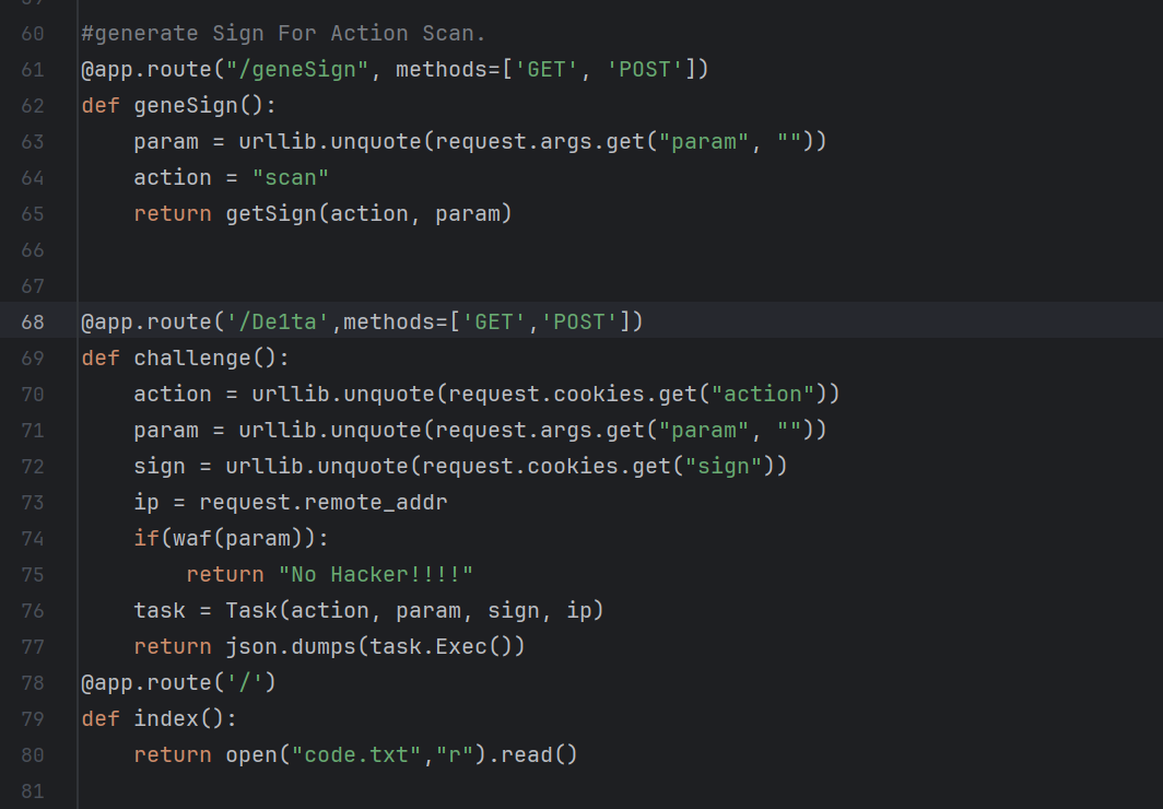 - /Delta:从 cookie 里获取 action 和 sign,再获取 param 参数,结合 ip 构造一个 Task 类的对象,再以 json 返回其 Exec 方法的执行结果。