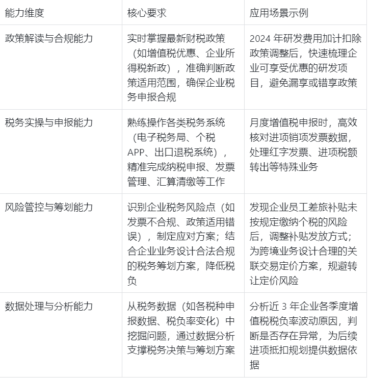 税务工作贯穿企业 “日常报税 - 风险防控 - 税务筹划 - 政策落地” 全流程,其核心能力可概括为四大维度,具体如下表所示: