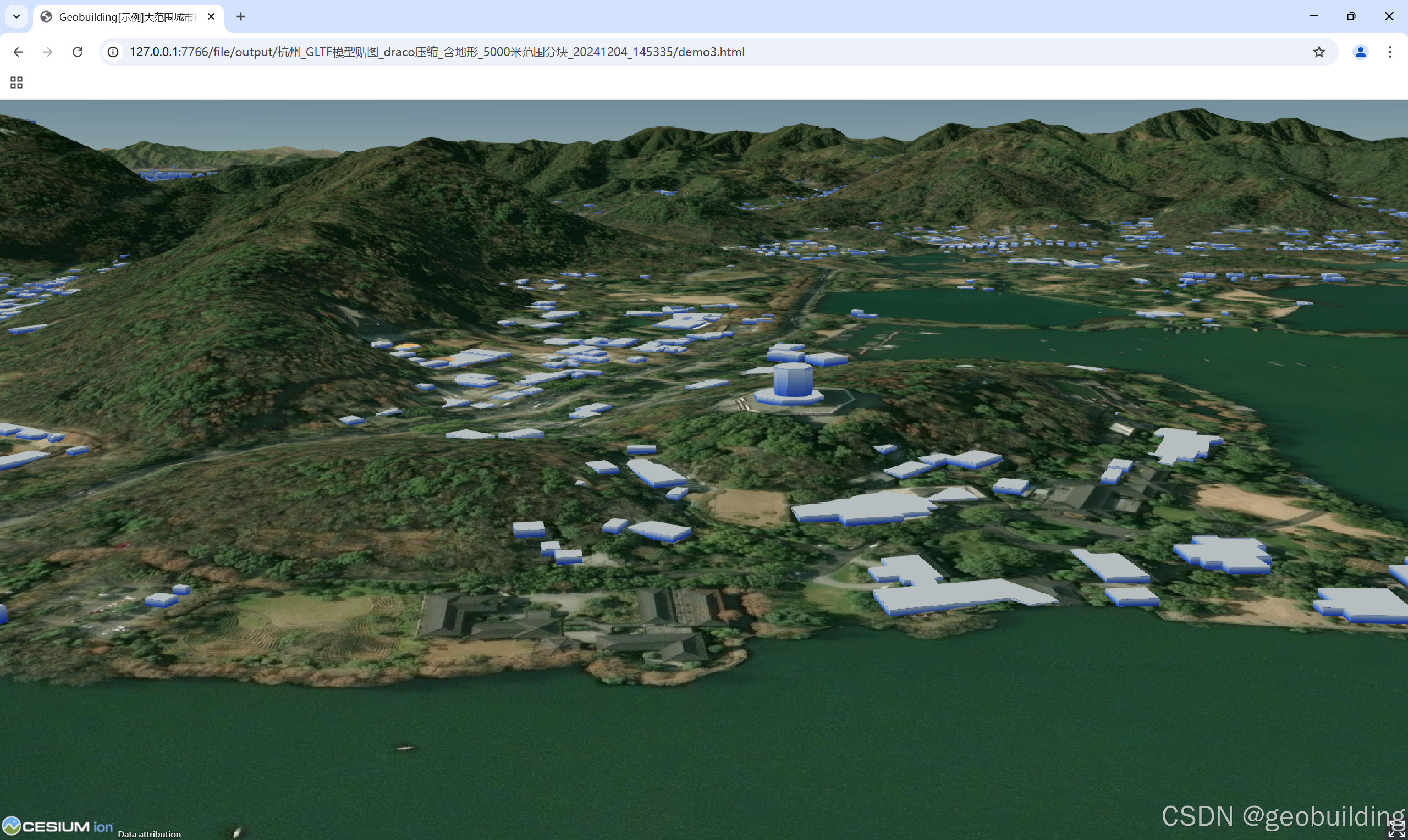 拉近视野,我们在西湖附近,看到了建筑物高低错落的加载到了 cesium地形上。