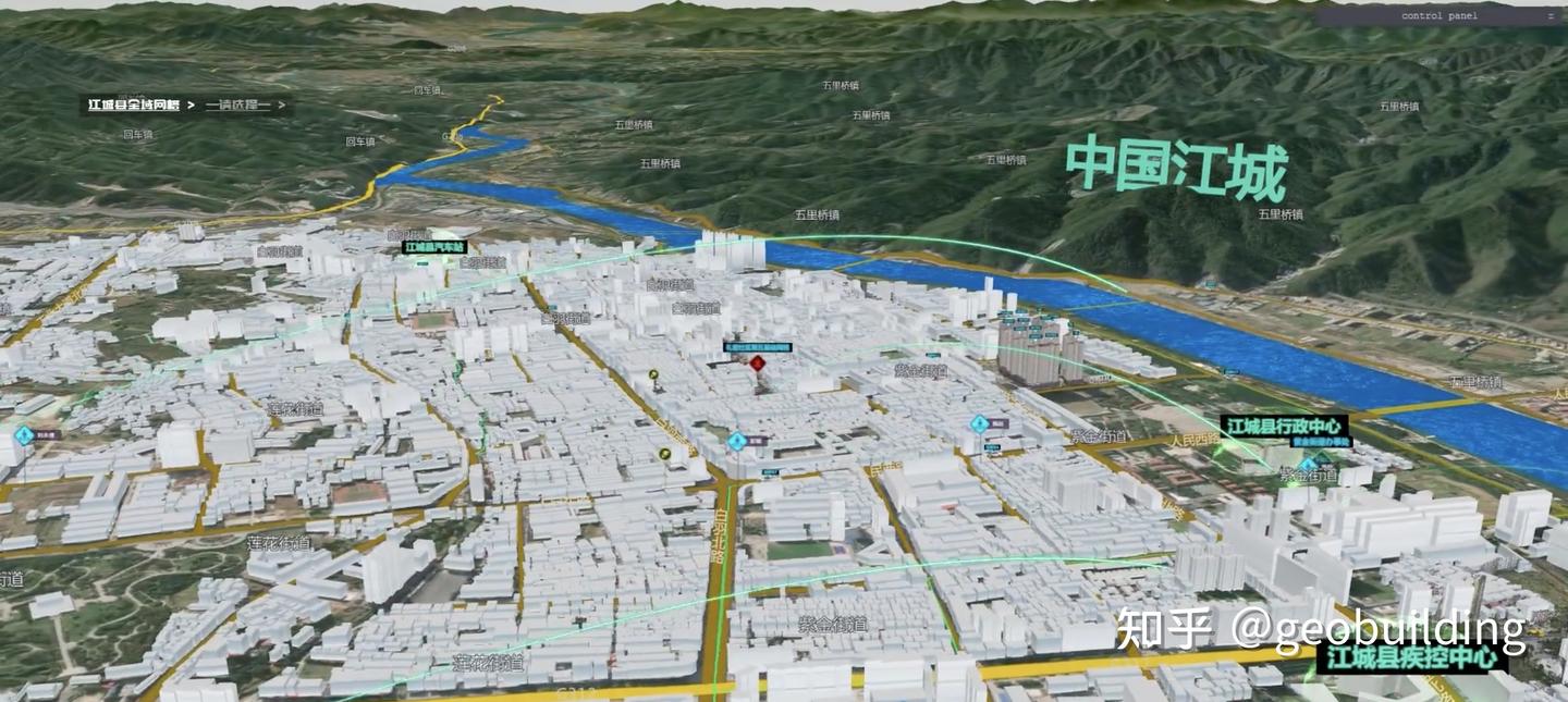 现在我们成功创建了地形建筑物。在特殊区域追加精模,如地标建筑。再加入常见的人、地、事、物、情、组织标记,加入常见的场景特效,一个丰富的极具视觉的可视化效果就做好了。