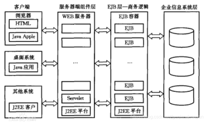 ·企业信息系统层:企业信息系统层包括了企业的现有系统(包括数据库系统、文件系统),J2EE提供了多种技术以访问这些系统,如JDBC访问DBMS。