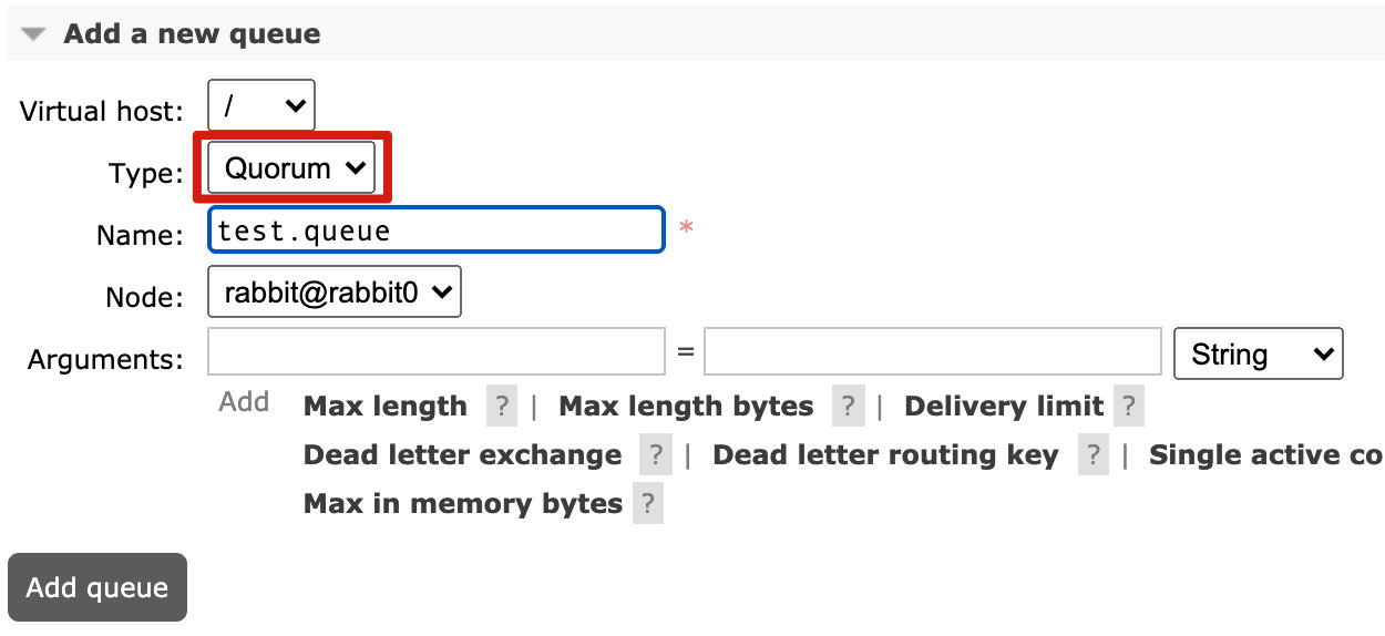 - 在RabbitMQ管理界面创建的时候,下拉框选择“Quorum”: