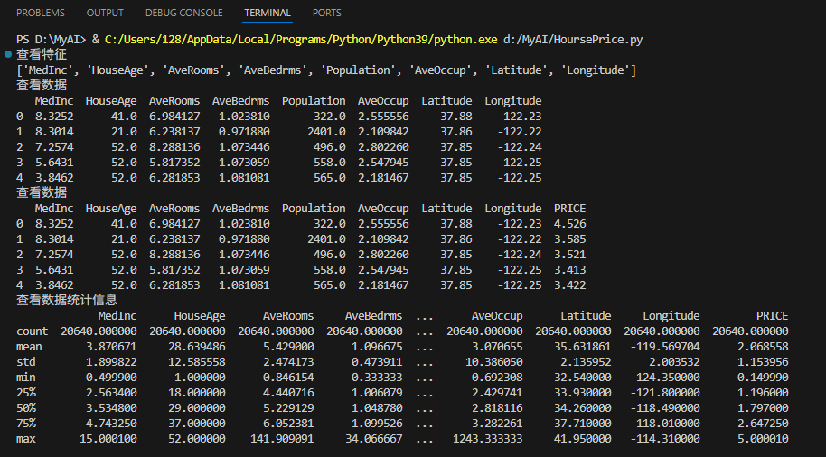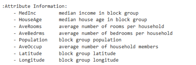 该数据的列名为['MedInc', 'HouseAge', 'AveRooms', 'AveBedrms', 'Population', 'AveOccup', 'Latitude', 'Longitude']