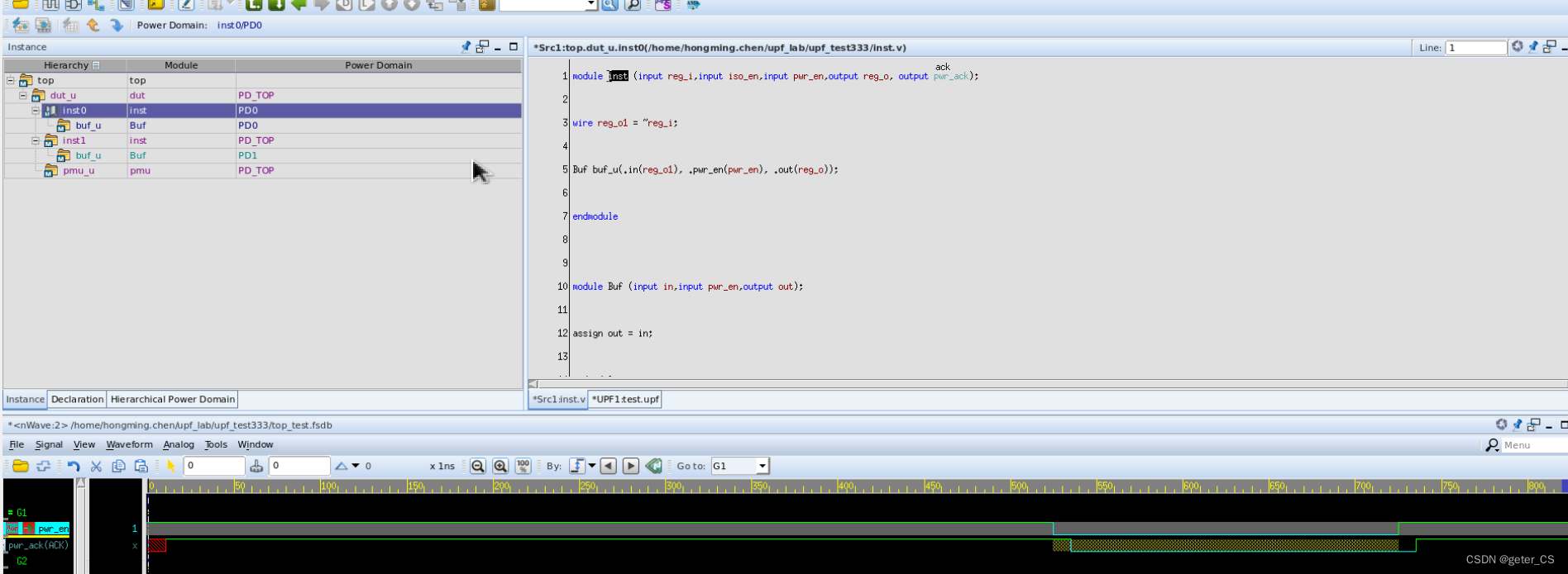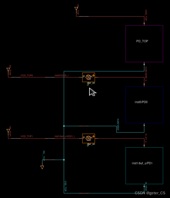 仿真结果的power map如下,其中PD0的power supply port和power switch的 output supply port使用VDD0_o连接起来,power switch通过pwr_en进行控制:
