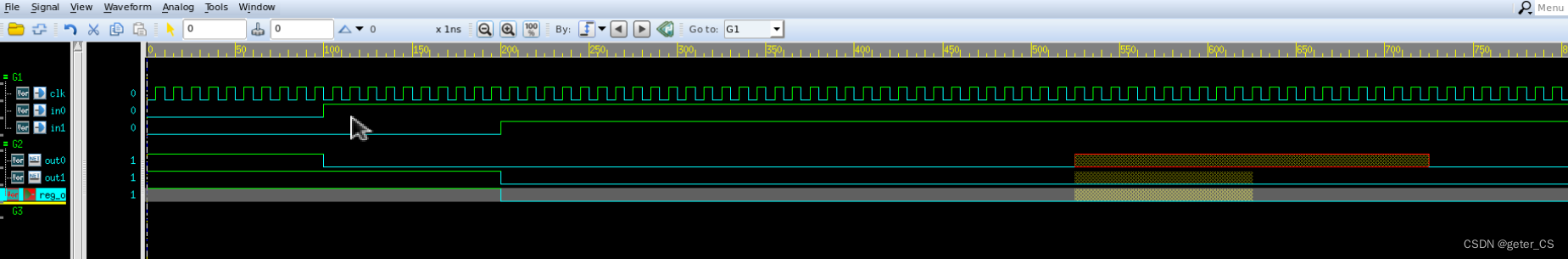 然后其他不变,仿真波形如下,可以看见en_ack是pwr_en(也就算是port en0)的响应,而且响应的布尔表达式是en0,延时10ns,也就是en_ack和en0的值是一样的,并比en0晚10ns变化。并且注意代码窗口中inst0的pwr_ack上有ack的标志: