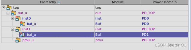 仿真结果的power map如下,此时有三个power domain,PD_TOP,PD0,PD1,其中PD0和PD1都有power switch控制: