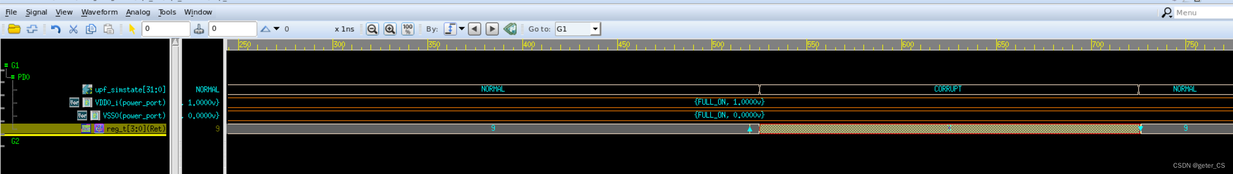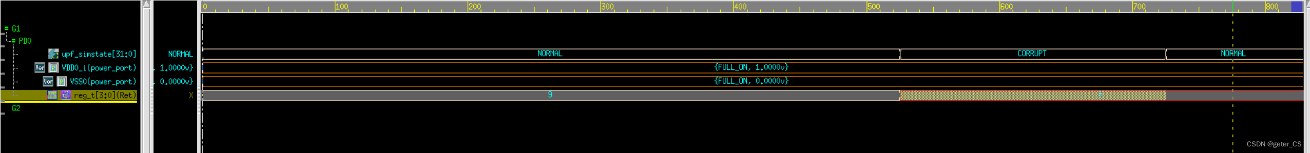 仿真结果波形,可以看见重新上电后reg_t恢复原值,且low power log中不在有警告: