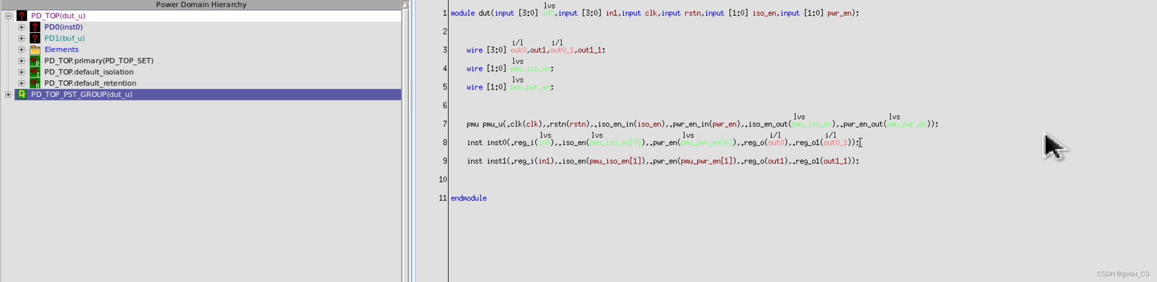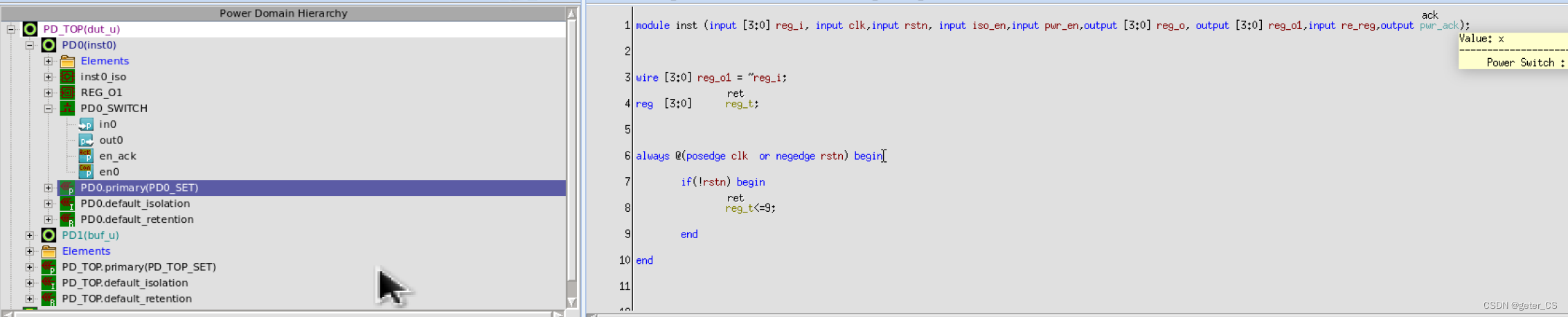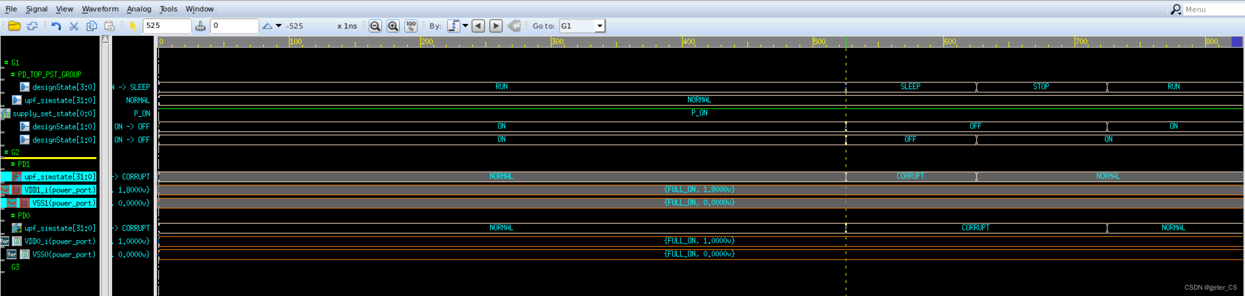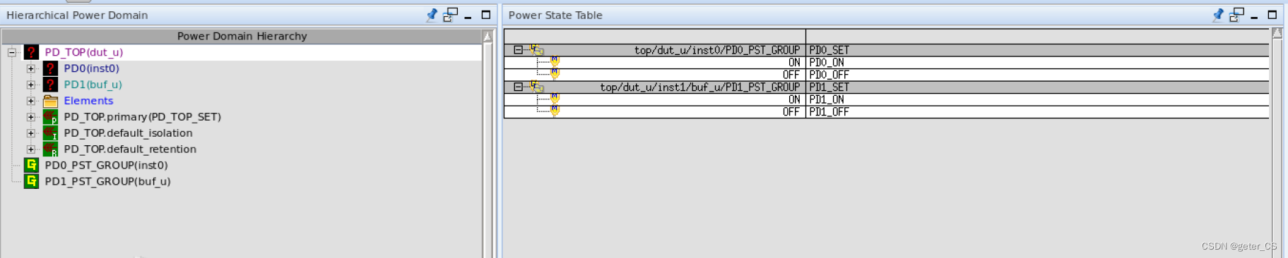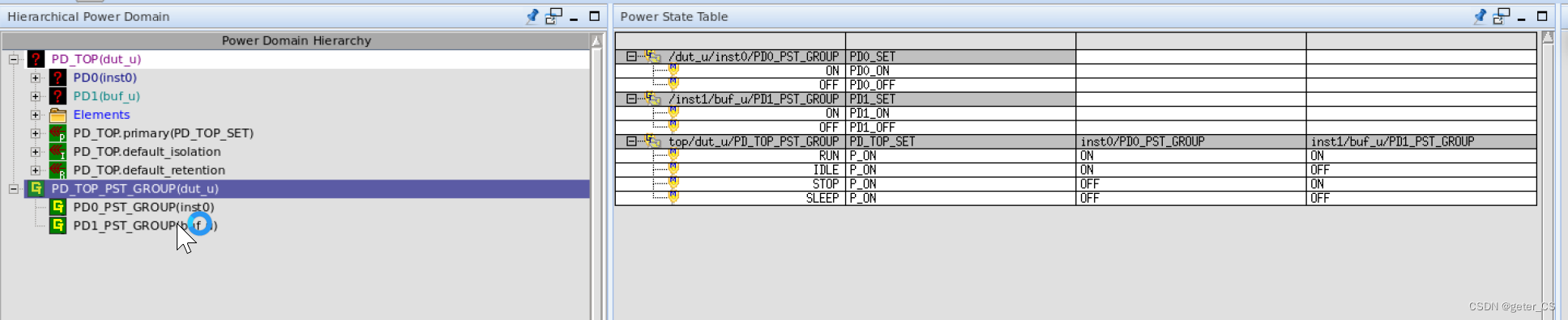 仿真结果,可以看见,PST中列出三个表,并且在power domain窗口中也显示出,PD_TOP_PST_GROUP将PD0和PD1的group包含了进去: