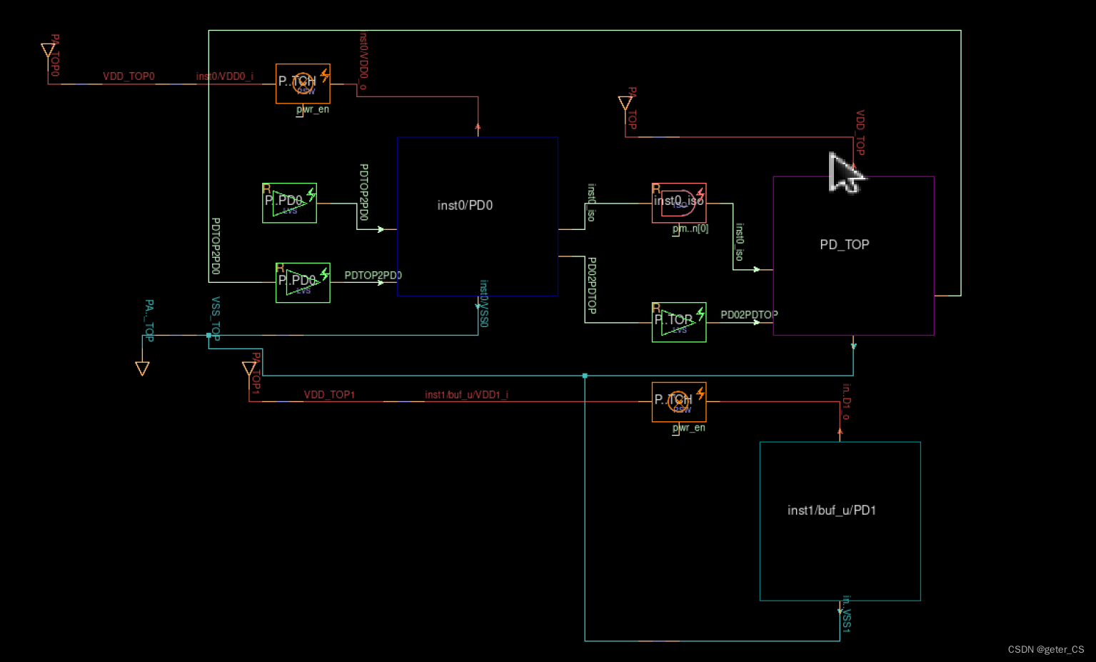 仿真结果的power map如下,其中PD0的power supply port和power switch的 output supply port使用VDD0_o连接起来,power switch通过pwr_en进行控制:
