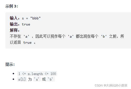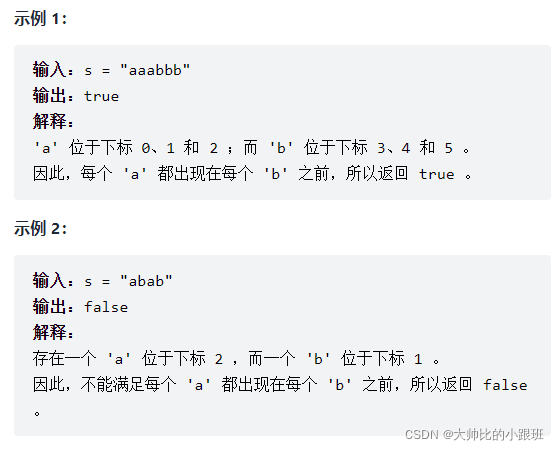 给你一个 仅 由字符 'a' 和 'b' 组成的字符串 s 。如果字符串中 每个 'a' 都出现在 每个 'b' 之前,返回 true ;否则,返回 false 。
