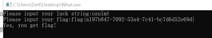 等待的时间可能比较长,但是跑出来"ozulmt"还是没问题的,这就是我们需要的luckstring。在输入之后,程序又提示我们输入flag。