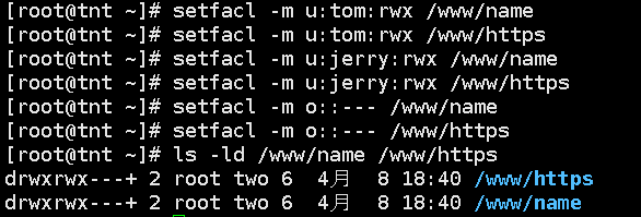 3、tom和jerry可以在name和https目录下新建和删除文件,其他用户没有任何权限。