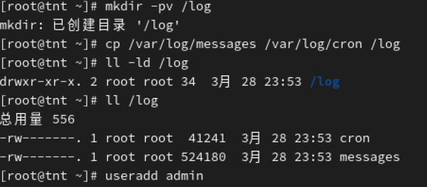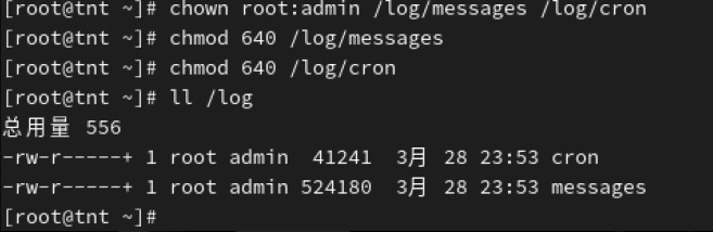4、复制/var/log/messages和/var/log/cron文件到/log目录,admin账号可以查看但不能修改该日志文件的内容。