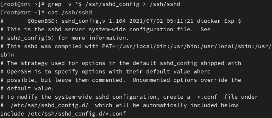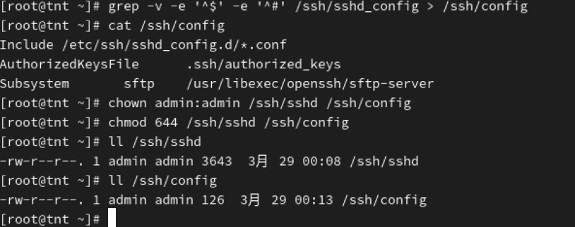 6、将复制过来的/ssh目录下的sshd_config文件中的非空行写入到/ssh/sshd文件中,将sshd_config文件中的非空行和非#号开头的行写入config文件中,并且admin可以查看sshd文件和config文件的内容。