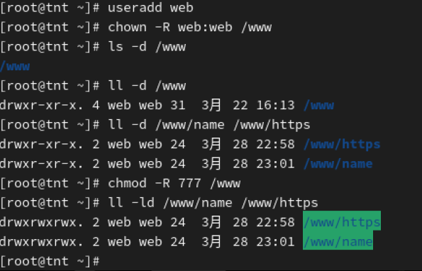 2、将/www目录和name,https目录的所属者修改为web用户,并且web用户拥有所有的权限。