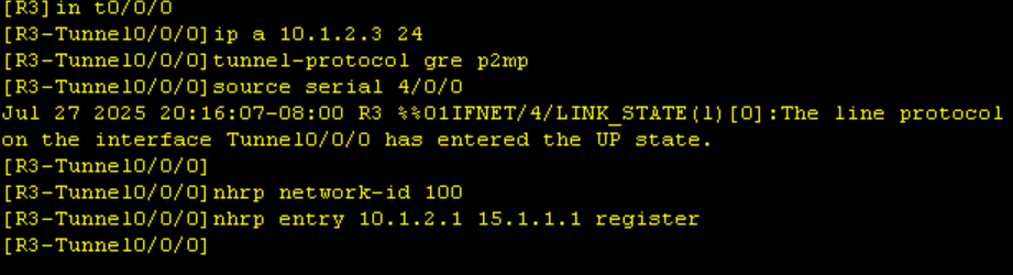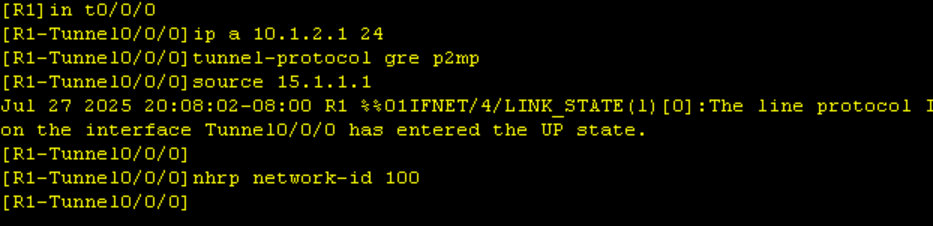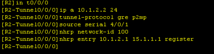 5、R1、R2、R3之间建立MGRE环境,且将R1配置为中心站点,R2、R3配置为分支站点。