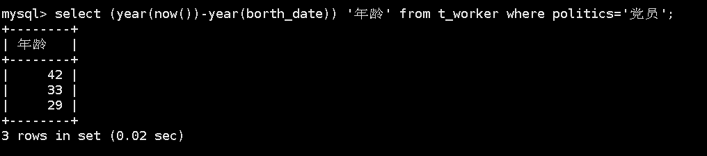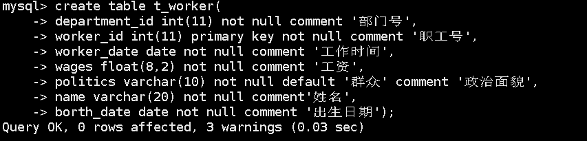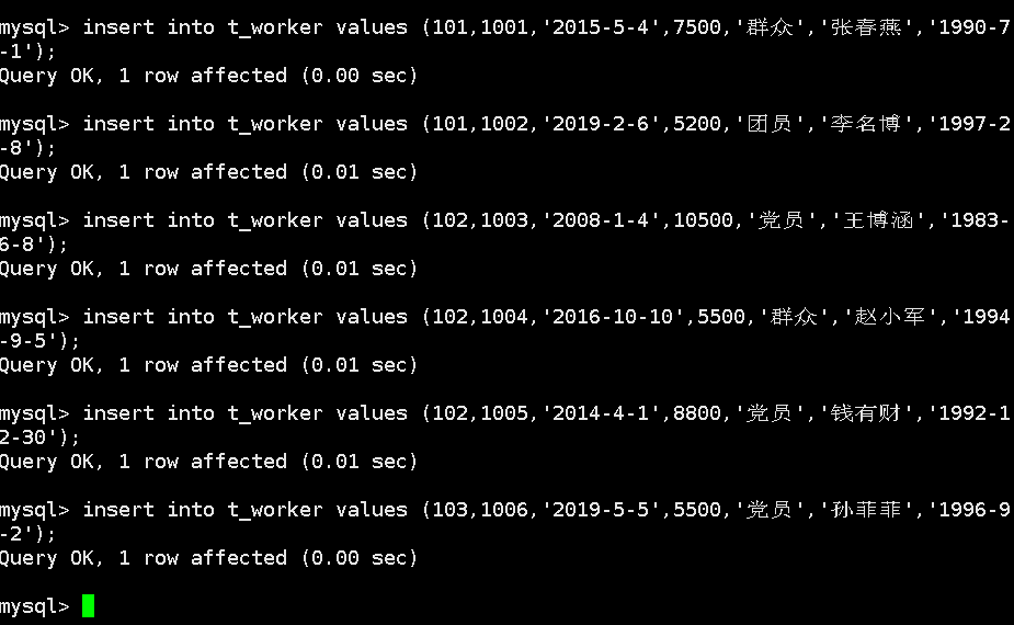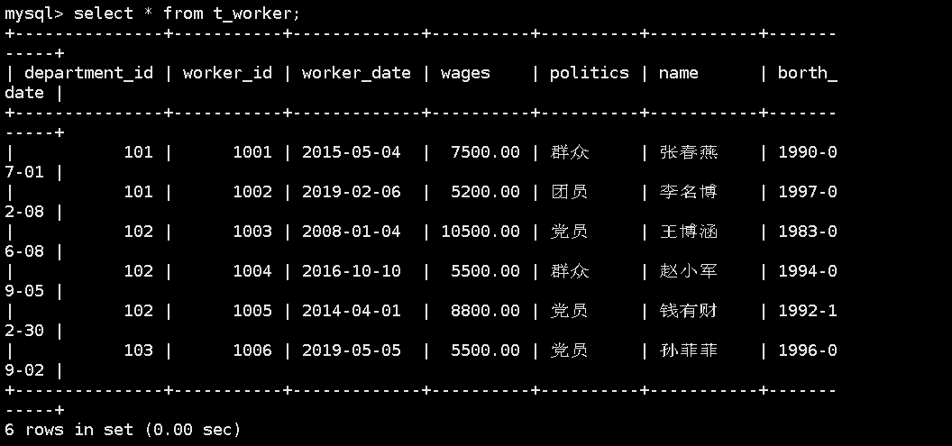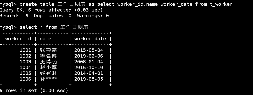 6、创建一个只有职工号、姓名和参加工作的新表,名为工作日期表: