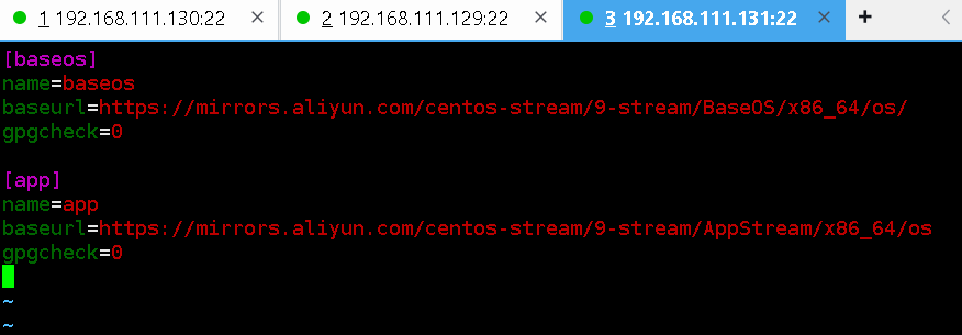 2、给三台虚拟机下载软件,在那之前需要先配置仓库,我使用的是阿里云的CentOS Stream 9镜像源