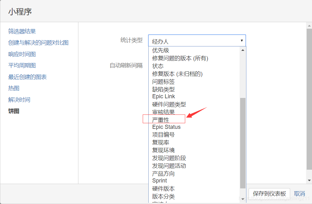 点击右下方的齿轮状,可以进行编辑,选择你需要的统计类型,我这边选择的是严重性,这也是在项目中使用的比较多的统计类型