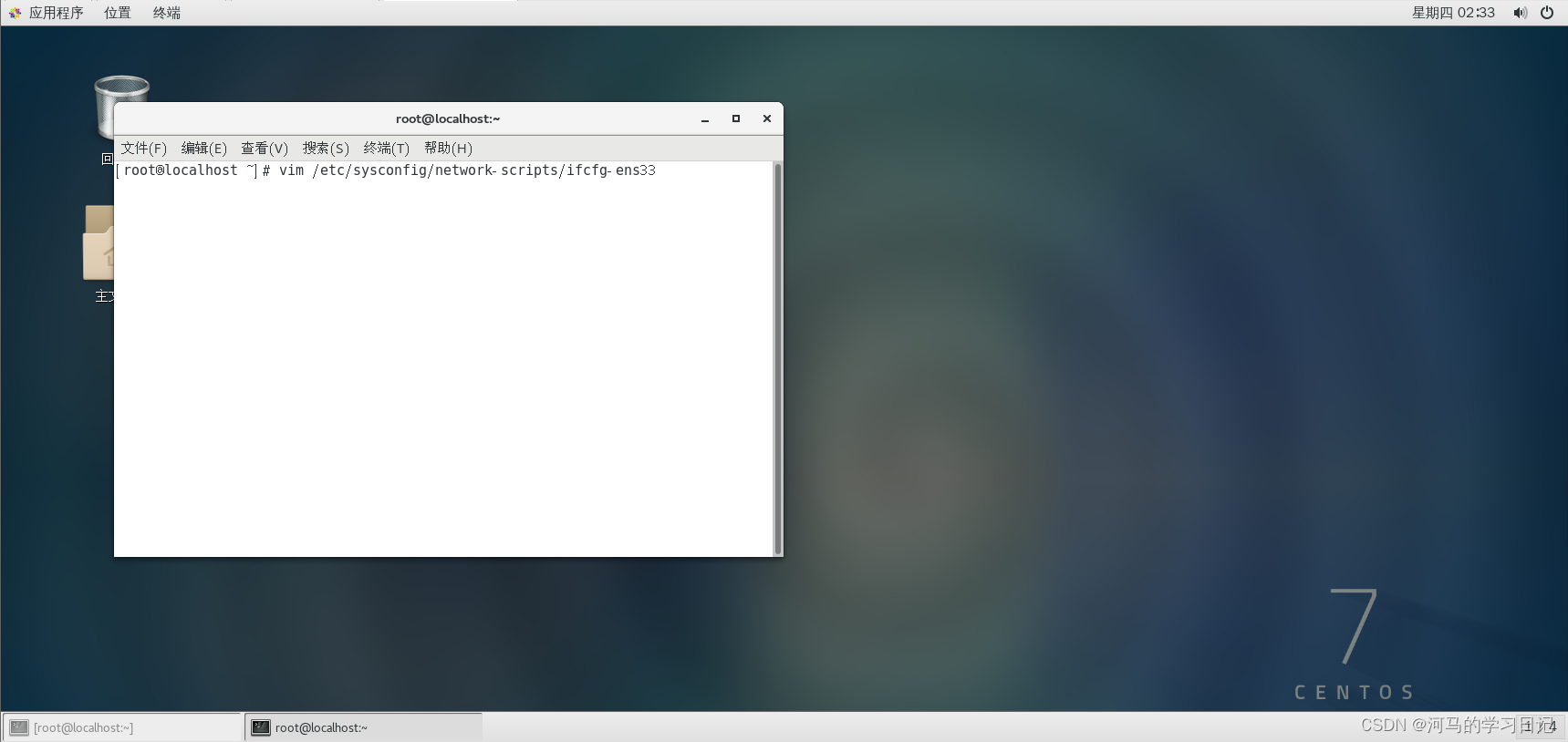 打开终端,输入:vim /etc/sysconfig/network-scripts/ifcfg-ens33,进入修改配置文件
