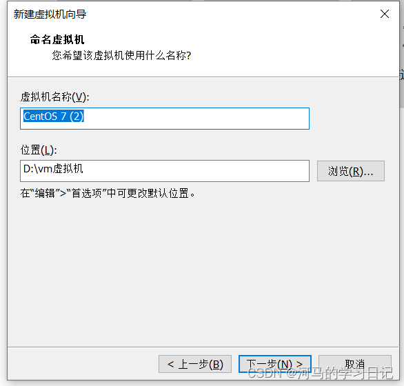 在这里我们要给自己新建的虚拟机起名字并且选择要存放的位置,这边建议新建一个文件夹用来存放虚拟机的文件,在设置好之后点击下一步