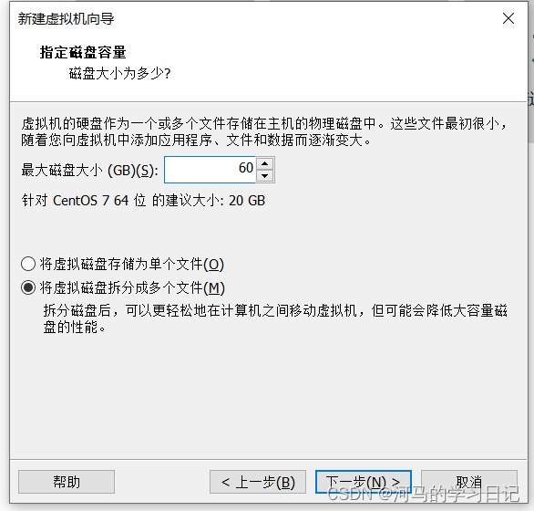 在这里我们要设置虚拟机的磁盘大小,建议设置60g,依据情况设置。