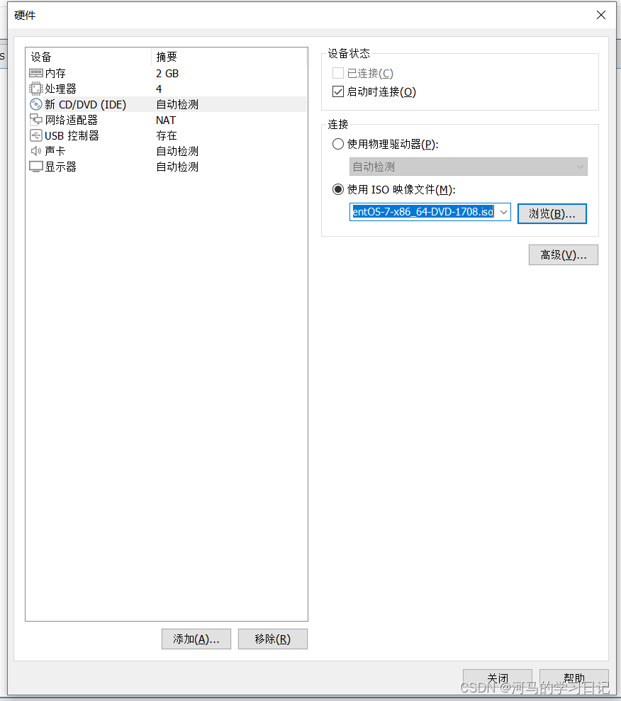 像这样设置自己的内存和处理器,内存建议2g以上,最重要的是要使用和自己虚拟机相匹配的ISO映像文件,设置完之后点击关闭,返回后点击完成即可