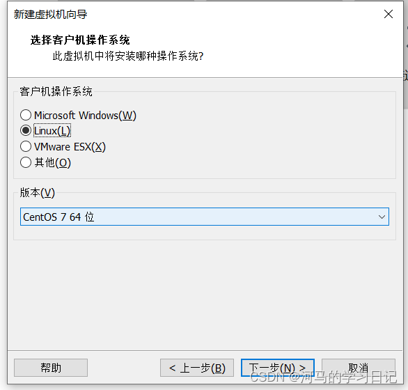 选择“Linux”操作系统和“CentOS 7 64位”版本,然后点击下一步