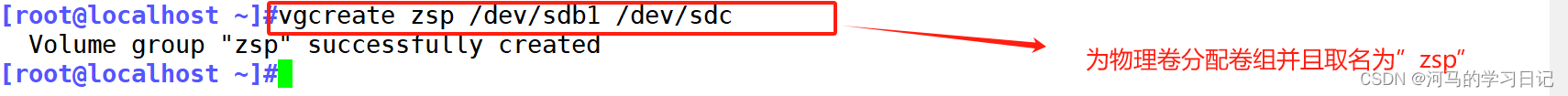 vgcreate + 卷名 + 物理卷名 建立卷组并取名并将物理卷加入卷组