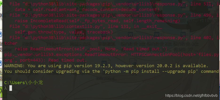 问题:2.如果出现以下的错误(见图2),则表示你安装超时或者pip版本过低。