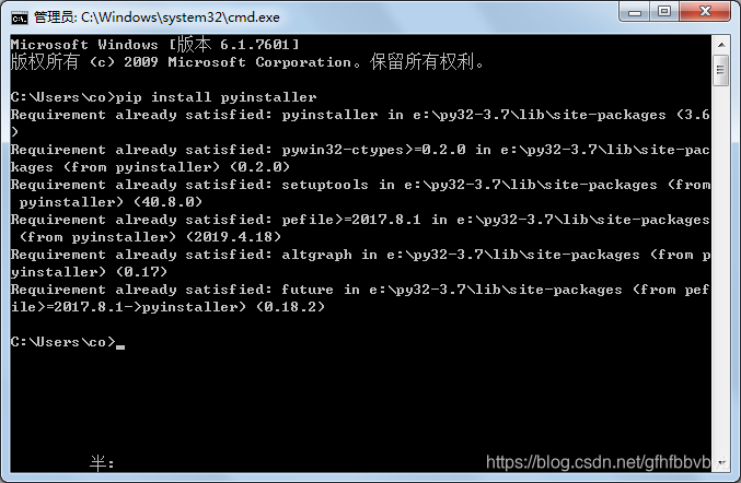 (2)在命令提示符中输入 ‘pip install pyinstaller’,此时会下载一些文件,等待下载完即可。