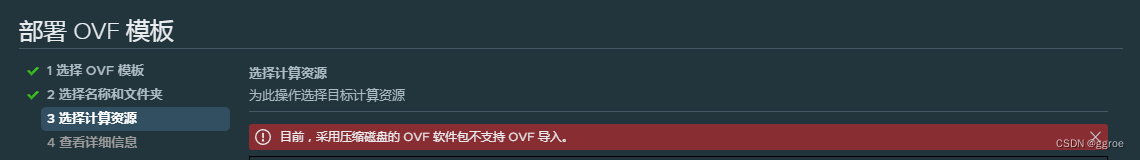本次是在vCenter 7上操作,发现下载的ova无法直接正常部署验证时会提示“目前,采用压缩磁盘的OVF软件包不支持OVF导入。”