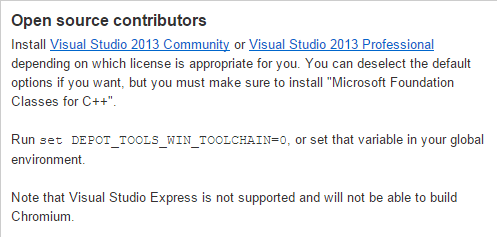 2.因为之前的Visual Studio Express(免费版)存在一些问题,微软也在update4中做了修复,所以现在官网说明用Visual Studio 2013 Update4(Community版或者Professional版)来编译,其他的版本不支持。另外windows系统版本必须是win7 64位以后的版本,32位的已经不支持了。