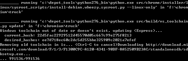 获取代码的最后一步是获取编译环境也就是Visual Studio 2013,上面所有的都成功以后,运行gclient runhooks就会把编译需要的vs2013的文件下载到本地,存储在depot_tools\win_toolchain\vs2013_files路径下,主要文件是编译需要的库文件。