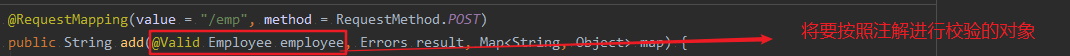 @RequestMapping(value = "/emp", method = RequestMethod.POST)public String add(@Valid Employee employee, Errors result, Map<String, Object> map) {// 打印错误消息 if (result.getErrorCount() > 0) { System.out.println("出错了!"); for (FieldError fieldError : result.getFieldErrors()) { System.out.println(fieldError.getField() + " --> " + fieldError.getDefaultMessage()); } } employeeDao.save(employee); return "redirect:/employeeList"; }