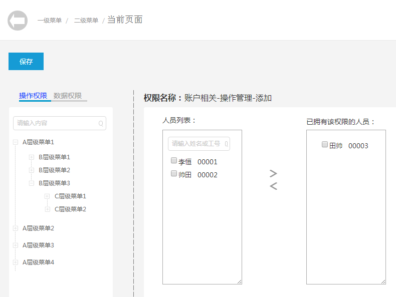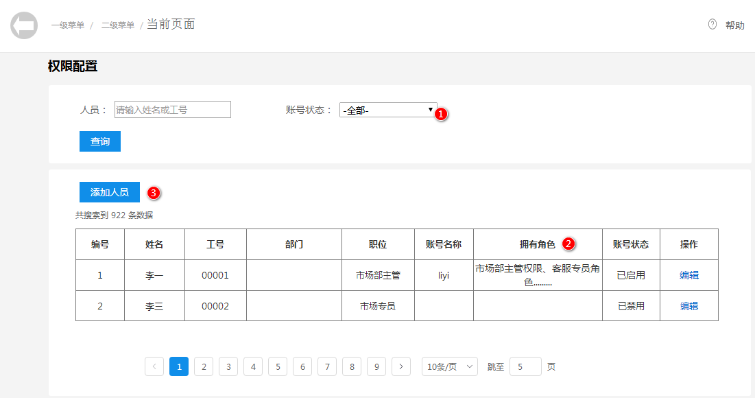 首先我们肯定有个账户列表,因为我们是给账户配置权限。里面可以查询到或者添加到所有的人(为什么说添加,因为很多大公司有很多的管理系统,而每一个管理系统只有一部分人用,所以不会把所有人都在账户列表显示出来,故用到了添加)。