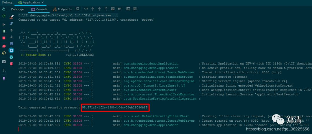 温馨小提示:在不进行任何配置的情况下,Spring Security 给出的默认用户名为user 密码则是项目在启动运行时随机生成的一串字符串,会打印在控制台,如下图: