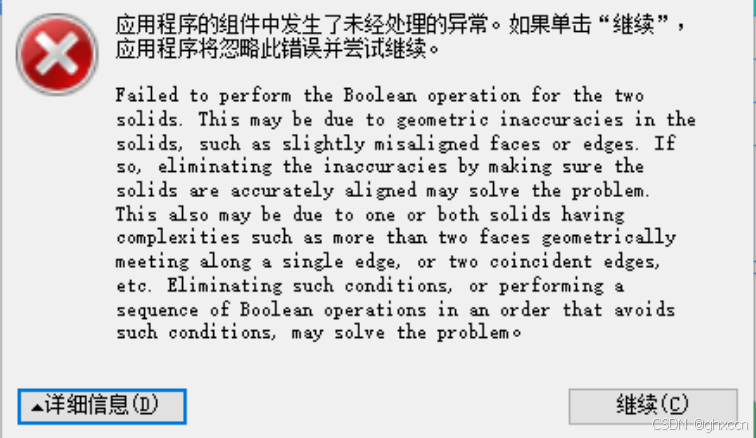 但是自Revit2017起,大量开发工程师都反馈这个布尔运算非常容易出错,只要处理的几何体出现一点细微问题,就会报错,导致程序崩溃。如下提示: