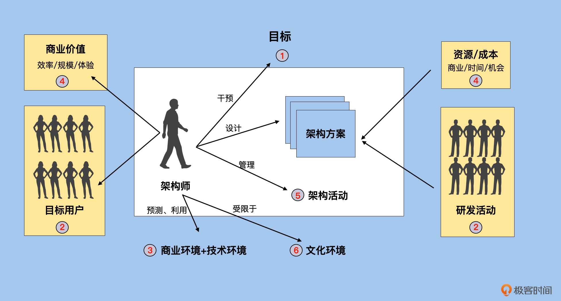 当我们把架构师的活动归纳总结后,很容易就能清楚到底是什么在影响整个架构活动的成败。我将它们总结归纳为六个要素,分别是:目标、资源、行为、天时、地利以及人和(要素的排列顺序与法则的顺序并不是一一对应的,在这节课的最后我会进行解释)。