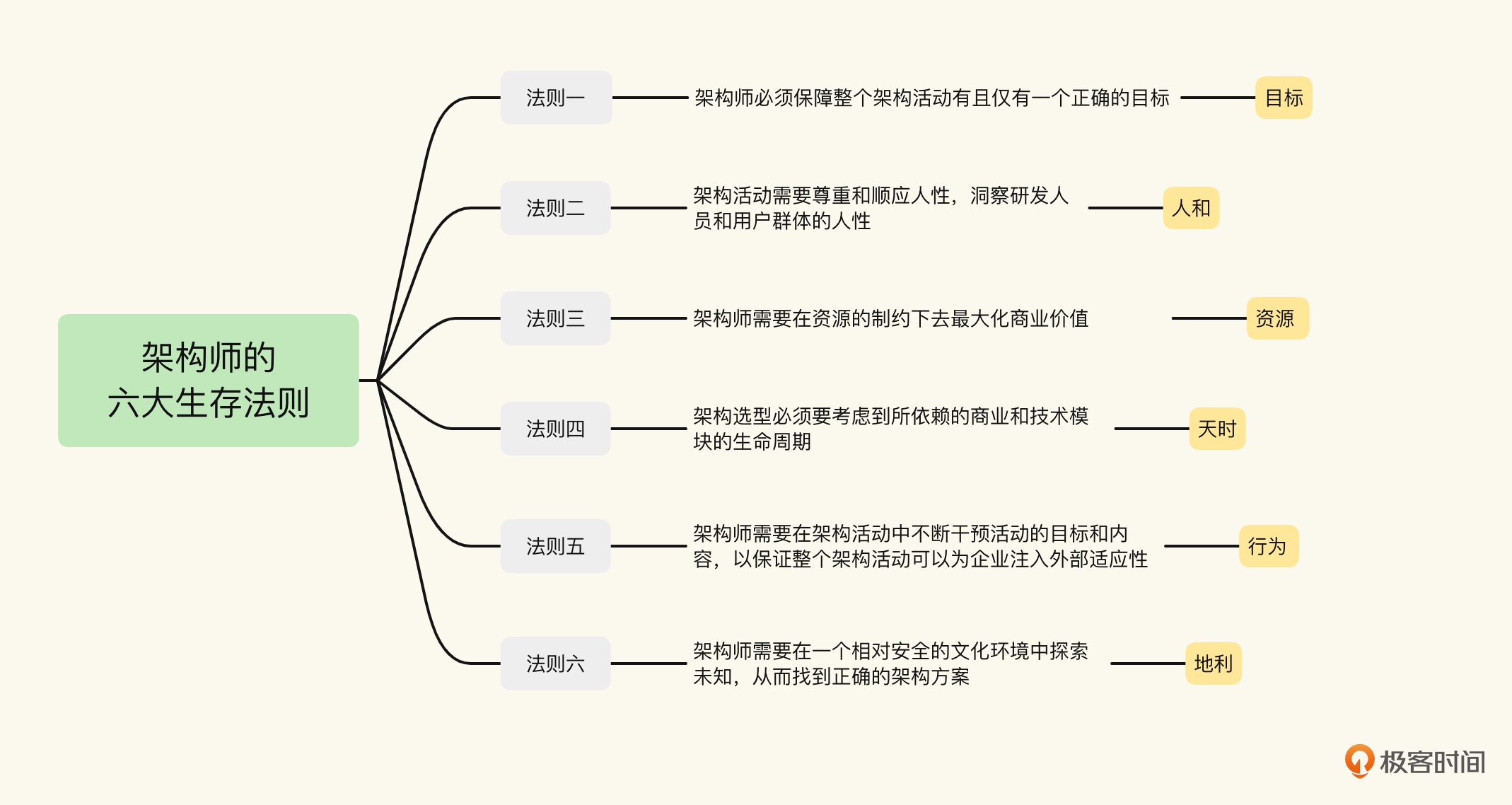 理解了影响架构活动的这些要素,我们很容易就知道应该以什么样的视角来关注和干预这些架构活动。而我根据这些,提炼出了你作为架构师必备的六大生存法则。