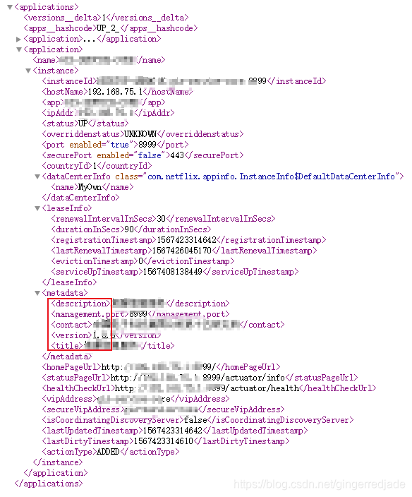 这样通过访问http://localhost:8761/eureka/apps,就可以查看到已注册的自定义Eureka元数据信息